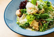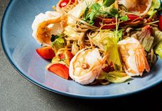210/50 г • Салатный микс, креветка темпура, стекланная лапша, салатный горох, ореховый соус