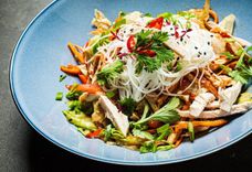 260/50 г • Рисовая лапша, куриная грудка, пекинская капуста, кинза, морковь, красный перец, соус хаосин, маринованный имбирь, чеснок, рисовый уксус, соевый соус, оливковое масло, кунжутное масло, острый чили соус, мед, сок лайма