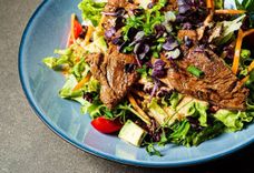 230/50 г • Микс салатов, говядина, морковь, авокадо, помидоры черри, соус терияки, перец чили, сакура кресс. Заправка: соус ким чи, соус ореховый